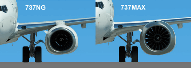 På 4. generation MAX med endnu større CFM LEAP-1B motorer, om end ikke helt så store som LEAP-1A på neo flyene (176 cm vs 198 cm), er motorerne nærmest placeret foran vingerne i stedet for under vingerne for at få nok frihøjde over jorden.