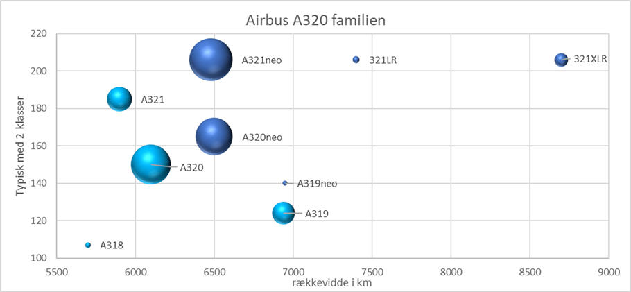 Airbus 320-familiens 2 generationer. Kapacitet med 2 klasser. Lys blå: ceo, Mørk blå: neo. Boblernes størrelse angiver antal solgte.