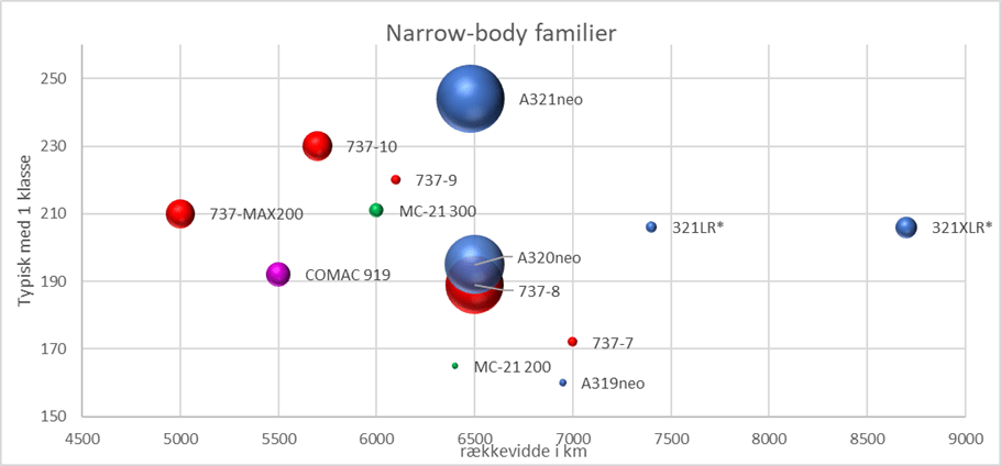 Aktuelle narrow-body familier. Kapacitet med 1 klasse. LR & XLR er med 2 klasser. Rød: Boeing 737MAX, Blå: Airbus A320neo, Violet: COMAC 919, Grøn: Irkut MC-21. Boblernes størrelse angiver estimeret antal solgte.