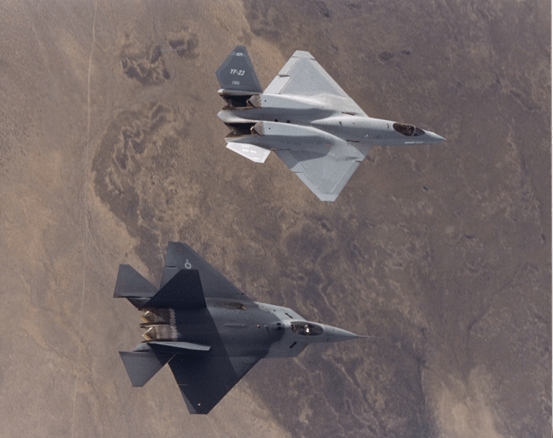Verdens første 5. generationsfly F-22 (EIS 2005) stammer fra USAF’s Advanced Tactical Fighter program fra 1980’erne, der havde til formål at udvikle et overlegent modsvar til Sovjetunionens Su-27 til erstatning for F-15. I finalen vandt Lockheed/Boeing/General Dynamics YF-22 over Northrop/McDonnell Douglas YF-23, som var et mere avanceret fly med ruddervators/V-tail (kombineret halefinner og haleplan) for at mindske radarsignaturen og udstødning på oversiden skærmet med keramiske kakler for at mindske den termiske signatur, men det var også et mere usikkert projekt og ikke så manøvredygtigt som YF-22 med 2D thrust vectoring.