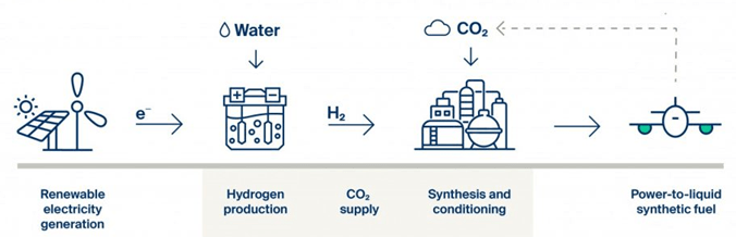 Syntetisk SAF er fremstillet direkte fra indfanget CO2 fra luften og brint udvundet af vand ved hjælp af grøn elektricitet.
