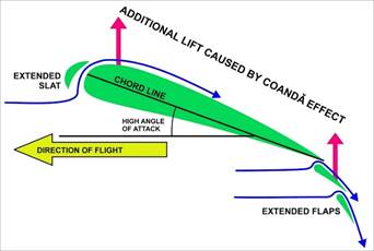 På vingens forkant kan være (leading-edge) slats, som sørger for ekstra luftstrømme over vingen og dermed ifølge Coanda-effekten en ekstra liftkraft.