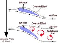 Meget simpelt sagt opstår der så læ bag vingen, som giver et undertryk, der suger vinden til sig og forøger hastigheden – det bliver lidt hønen og ægget, for er det undertryk der skaber den høje hastighed eller omvendt?